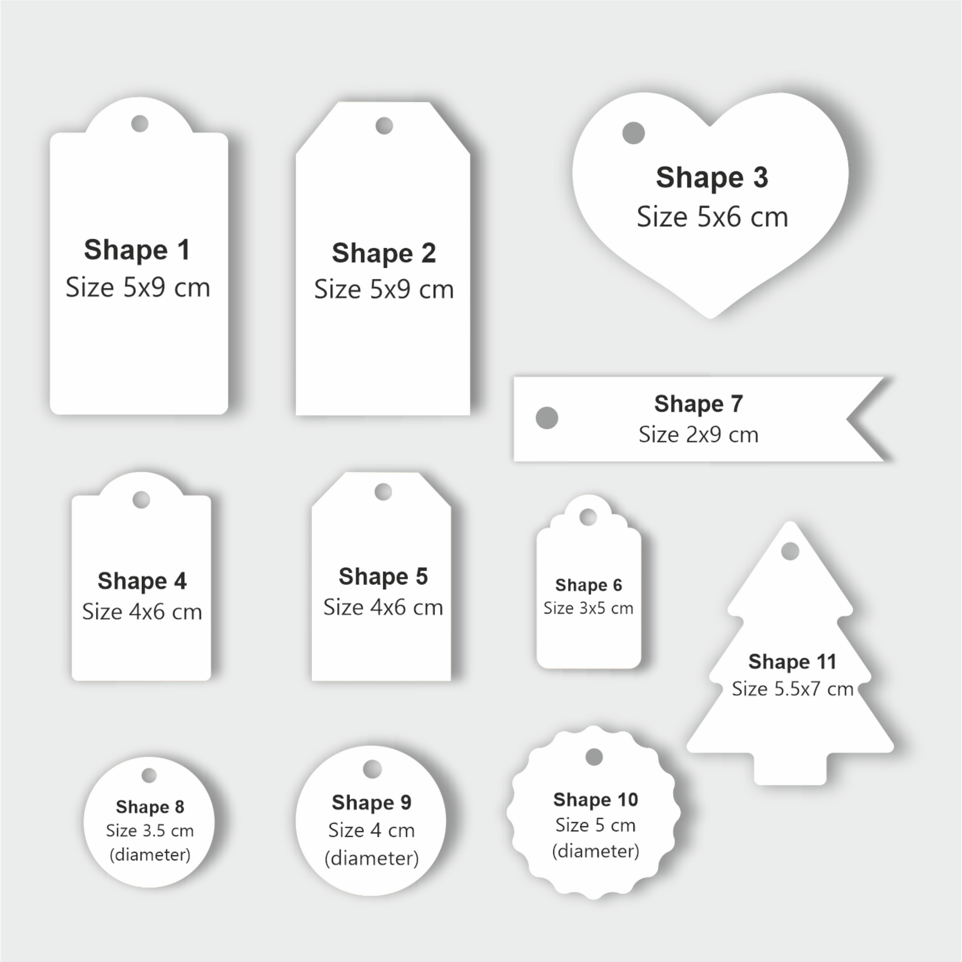 Shape 1 (size 5x9 cm) will be 10 tags, if you want 20 tags, just choose quantity 2